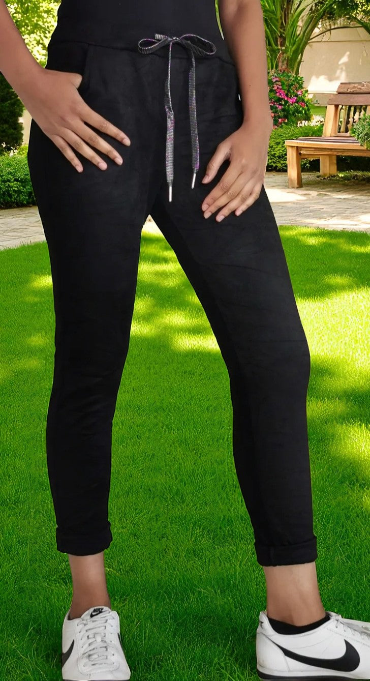 Pantalon en suedine avec poches marie confort et cool . Le cordon et l elastique a la taille assure un ajustement parfait. La matiere "Peau de peche" est douce et lisse au toucher,et l elasticite est le point fort du pantalon.